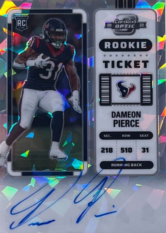 The Dameon Pierce 2022 Contenders Optic #111 Rookie Ticket Auto - Cracked Ice Ticket /22 card in Raw condition has not changed in price in the last 30 days and was last sold for $202.50 .
