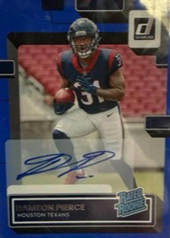 The Dameon Pierce 2022 Donruss #340 Rated Rookie Autographs - Blue card in Raw condition has not changed in price in the last 30 days and was last sold for $3.51 .