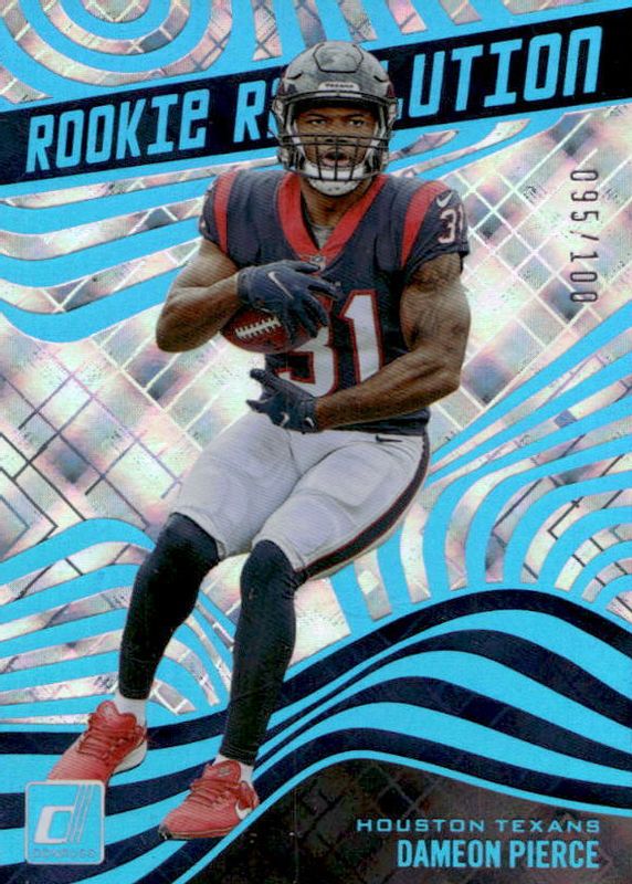 The Dameon Pierce 2022 Donruss #REV-39 Rookie Revolution - Cosmic /100 card in Raw condition has not changed in price in the last 30 days and was last sold for $3.50 .