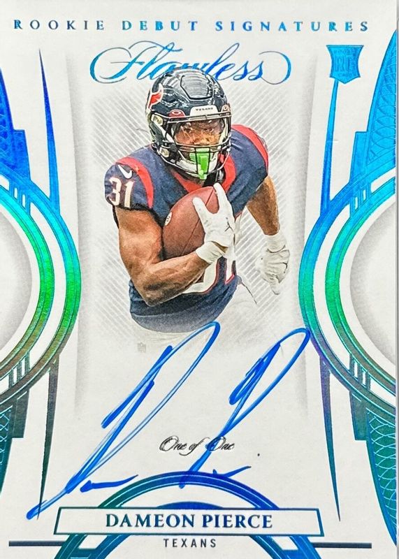 This card is 1 of 50 Dameon Pierce's card variations in the 2022 Flawless set being tracked by Sports Card Investor, including Rookie Debut Signatures (/25), Rookie Debut Signatures - Ruby (/15), Rookie Debut Signatures - Sapphire (/10), Rookie Debut Signatures - Silver (/20), and Rookie Frame Signatures (/20).