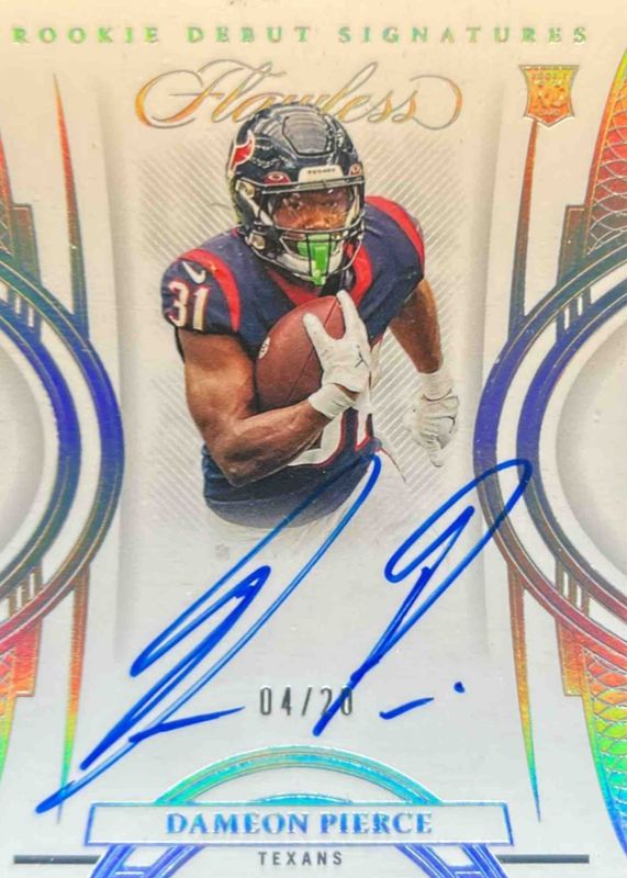 The Dameon Pierce 2022 Flawless #RDS-DP Rookie Debut Signatures - Silver (/20) card in Raw condition has not changed in price in the last 30 days and was last sold for $14.50 .