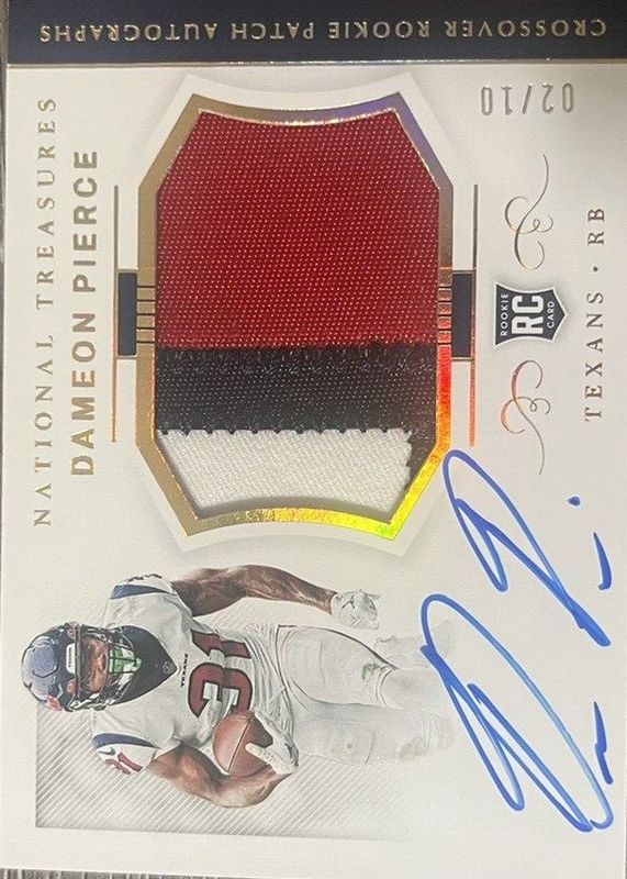 The Dameon Pierce 2022 National Treasures #CRPA-DP Crossover Rookie Patch Autographs - Holo Gold /10 card in Raw condition has not changed in price in the last 30 days and was last sold for $35.00 .
