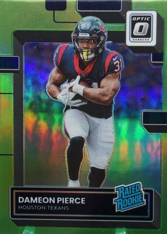 The Dameon Pierce 2022 Optic #240 Lime Green /35 Rookie card in Raw condition has not changed in price in the last 30 days and was last sold for $44.00 .