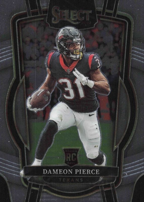 This card is 1 of 162 Dameon Pierce's card variations in the 2022 Select set being tracked by Sports Card Investor, including Concourse, Field Level, Suite Level, Club Level Black & Green Die-Cut, and Club Level Black & Red Die-Cut.