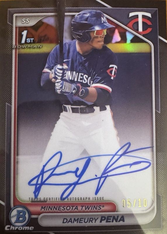 The Dameury Pena 2024 Bowman Chrome #CPA-DPE Prospect Auto - Black Refractor /10 (1st) card in Raw condition has not changed in price in the last 30 days and was last sold for $56.00 .