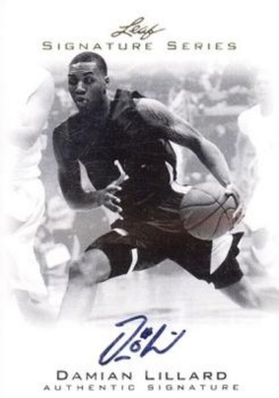 The Damian Lillard 2012 Leaf Signature Series #BA-DL1 Base Rookie card is 1 of 61 Damian Lillard's card variations in the 2012 Leaf Signature Series set being tracked by Sports Card Investor, including Silver /99, Gold /25, Blue /10, Red /5, and Printing Plates Black /1.
