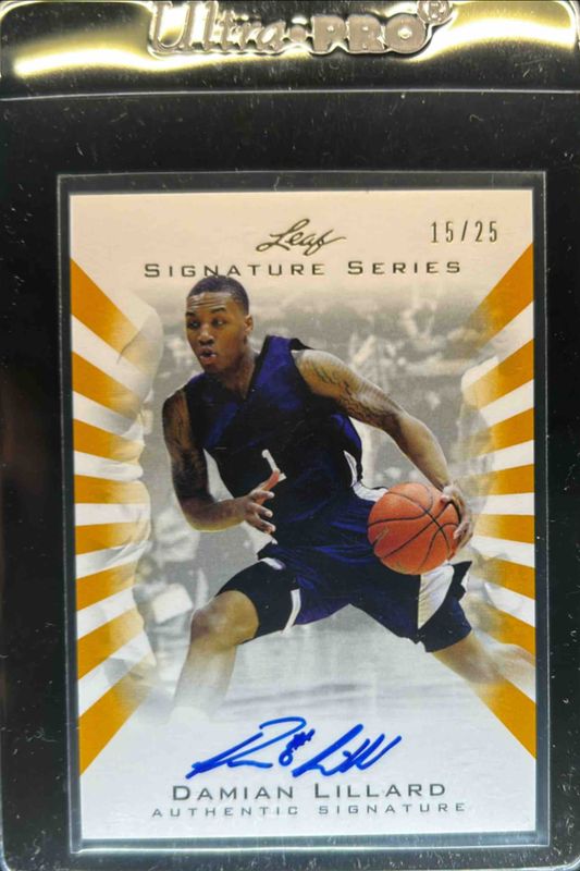 The Damian Lillard 2012 Leaf Signature Series #BA-DL1 Gold /25 Rookie card is 1 of 61 Damian Lillard's card variations in the 2012 Leaf Signature Series set being tracked by Sports Card Investor, including Base, Silver /99, Blue /10, Red /5, and Printing Plates Black /1.
