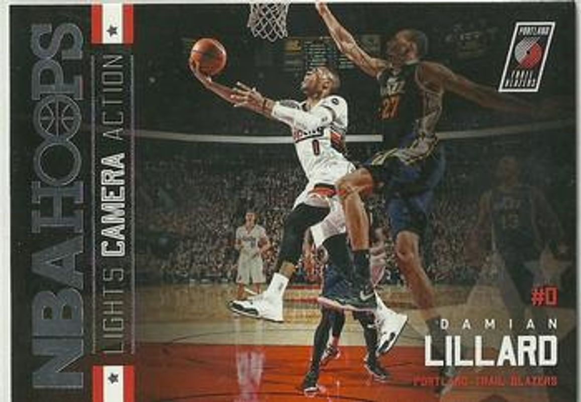 The Damian Lillard 2015 Hoops #27 Lights...Camera...Action! card is 1 of 23 Damian Lillard's card variations in the 2015 Hoops set being tracked by Sports Card Investor, including Base, Gold, Green, Red Back, and Blue /399.