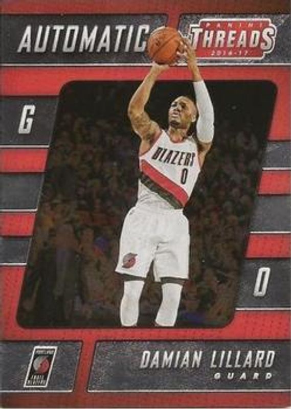 The Damian Lillard 2016 Threads #6 Automatic card is 1 of 32 Damian Lillard's card variations in the 2016 Threads set being tracked by Sports Card Investor, including Base, Century Proof Dazzle, Century Proof Holo, Century Proof Red /199, and Century Proof Dazzle Orange /25.