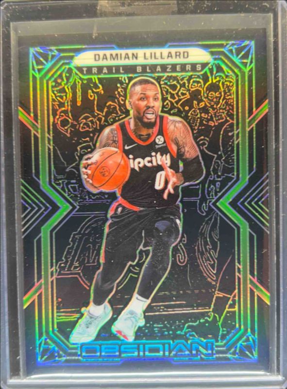 The Damian Lillard 2021 Obsidian #49 Electric Etch Green /25 card is 1 of 39 Damian Lillard's card variations in the 2021 Obsidian set being tracked by Sports Card Investor, including Base, Electric Etch Asia, Electric Etch Blue Flood, Electric Etch Red Flood, and Electric Etch White Pulsar.