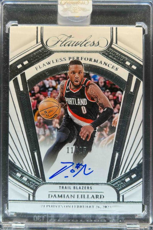 The Damian Lillard 2023 Flawless #FP-DML Flawless Performances /25 card is 1 of 49 Damian Lillard's card variations in the 2023 Flawless set being tracked by Sports Card Investor, including Base /20, Gold /10, Emerald /5, Bronze /3, and Platinum /1.