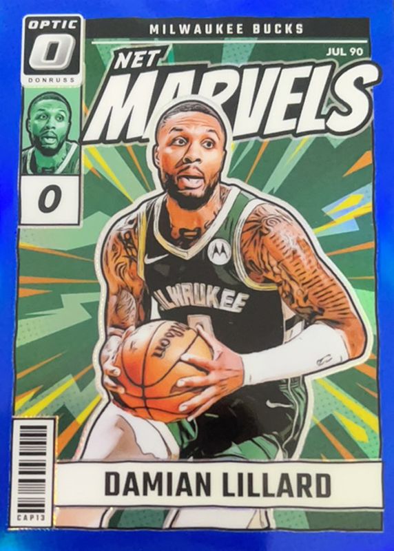 The Damian Lillard 2024 Optic #20 Net Marvels - Blue /49 card in Raw condition has moved up $4.50 (+56.3%) in the last 30 days and was last sold for $12.50 .