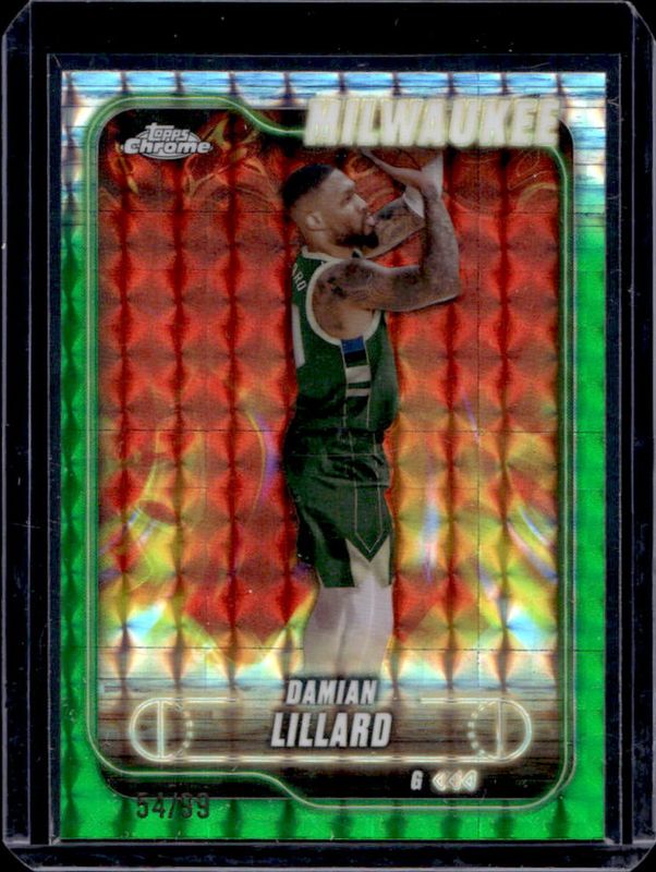 The Damian Lillard 2024 Topps Chrome #2 Green Geometric Refractor /99 card is 1 of 72 Damian Lillard's card variations in the 2024 Topps Chrome set being tracked by Sports Card Investor, including Base, Blue Basketball Refractor, Magenta Refractor, Negative Refractor, and Pink Basketball Refractor.