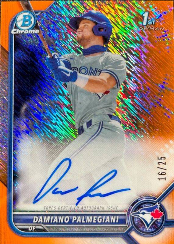 Auctions Ending Soon for Damiano Palmegiani 2022 Bowman #CPA-DP Chrome Prospect Auto - Orange Shimmer Refractor /25 (1st) RAW