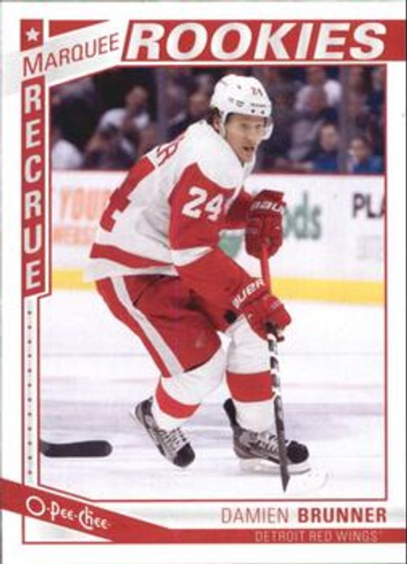The Damien Brunner 2013 O-Pee-Chee #590 Base Rookie card is 1 of 6 Damien Brunner's card variations in the 2013 O-Pee-Chee set being tracked by Sports Card Investor, including Rainbow, Red, Retro, Retro Blank Back, and Black Rainbow /100.