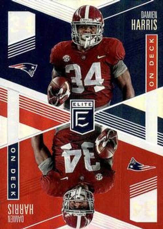 The Damien Harris 2019 Elite #RD-13 Rookie on Deck card is 1 of 31 Damien Harris' card variations in the 2019 Elite set being tracked by Sports Card Investor, including Green, Red /299, Purple /99, Orange /49, and Aspirations Die-Cut /24.