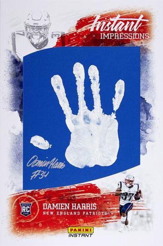 The Damien Harris 2019 Panini Instant #NNO Instant Impressions /5 Rookie card is 1 of 17 Damien Harris' card variations in the 2019 Panini Instant set being tracked by Sports Card Investor, including Draft Night, Rated Rookie Retro /280, Draft Night - Black /25, Centennial Leather /10, and Clear Vision - Autographed Relics /10.