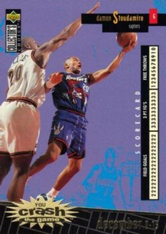 The Damon Stoudamire 1996 Upper Deck Collector's Choice Italian #C26a You Crash the Game Scoring - Gold card is 1 of 6 Damon Stoudamire's card variations in the 1996 Upper Deck Collector's Choice Italian set being tracked by Sports Card Investor, including #151 Base, #S26 Super Action Stick 'Ums, #C26a You Crash the Game Scoring, #C26b You Crash the Game Scoring, and #C26b You Crash the Game Scoring - Gold.