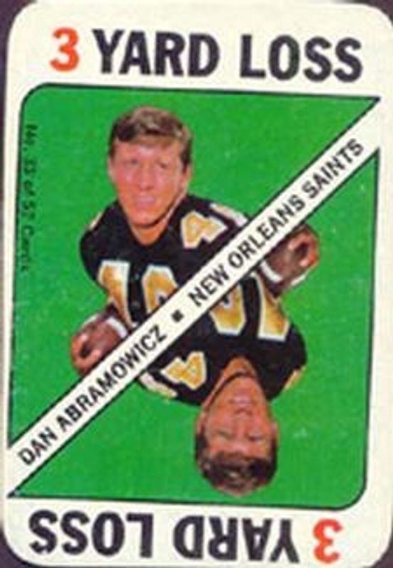The Dan Abramowicz 1971 Topps #33 Game Inserts card is 1 of 4 Dan Abramowicz's card variations in the 1971 Topps set being tracked by Sports Card Investor, including Base, Posters, and Posters - Glossy.