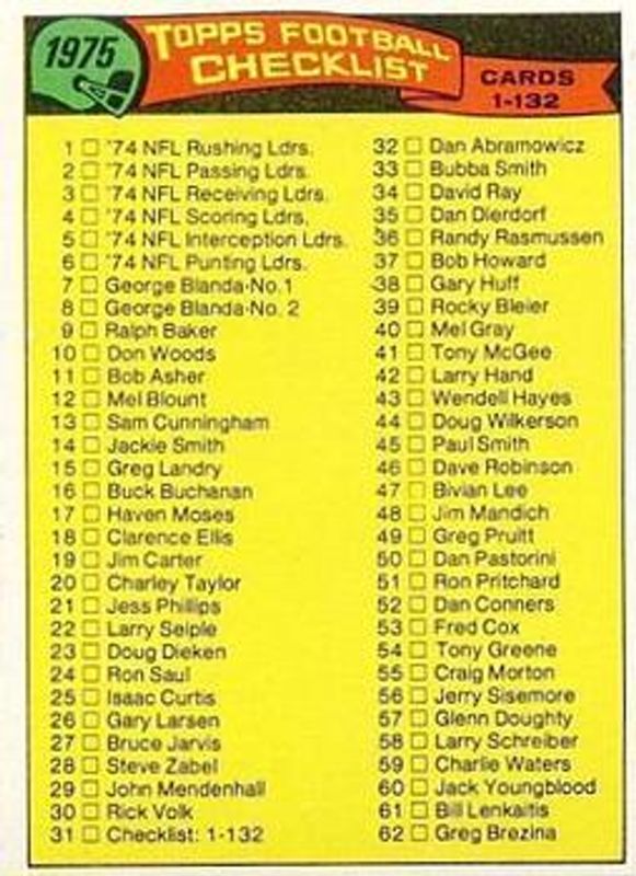 Other popular players in the 1975 Topps set include George Blanda, Checklist, Chester Marcol / Roy Gerela, Cliff Branch, and Emmitt Thomas.