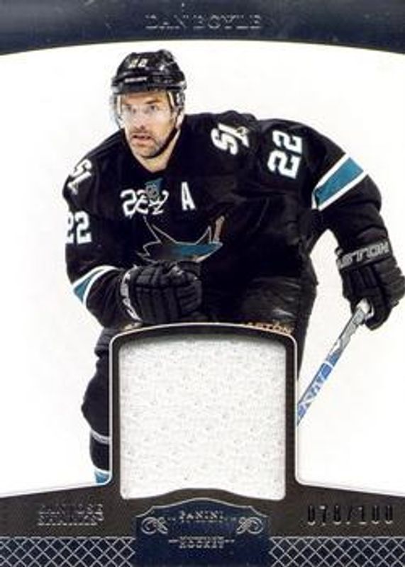 The Dan Boyle 2011 Dominion #78 Jerseys /100 card is 1 of 6 Dan Boyle's card variations in the 2011 Dominion set being tracked by Sports Card Investor, including Autographed Patches /60, Jerseys Prime /25, Jerseys Patches /10, Strapping Lads /10, and Strapping Lads Snaps /3.