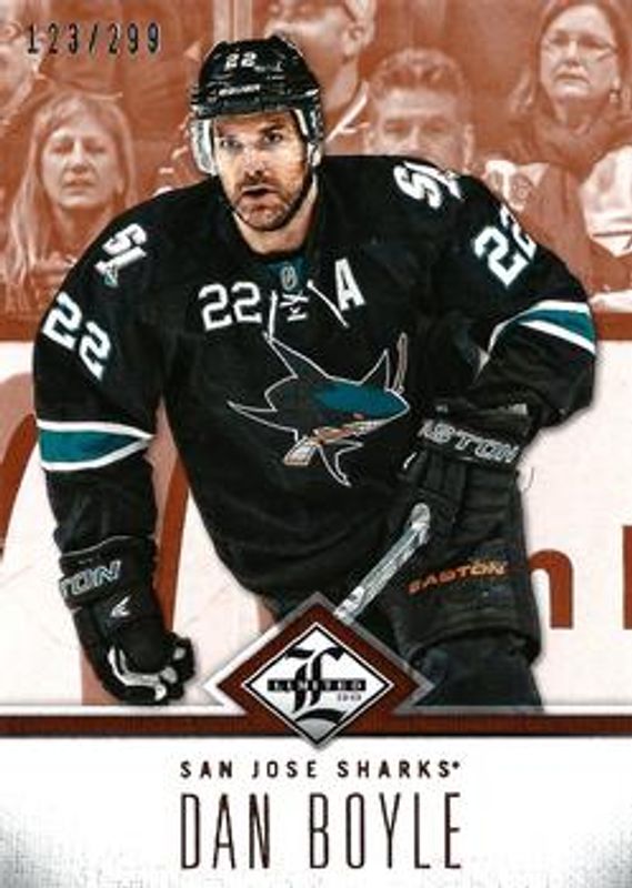 The Dan Boyle 2012 Limited #40 Base /499 card is 1 of 14 Dan Boyle's card variations in the 2012 Limited set being tracked by Sports Card Investor, including Silver /49, Gold /25, Emerald /5, Platinum /1, and Printing Plate Black /1.