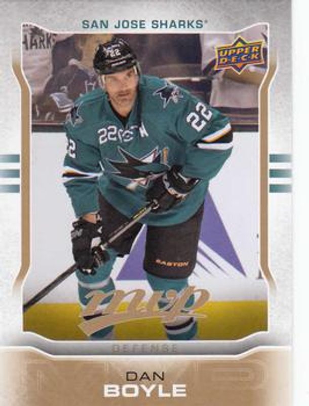The Dan Boyle 2014 Upper Deck MVP #94 Base card is 1 of 9 Dan Boyle's card variations in the 2014 Upper Deck MVP set being tracked by Sports Card Investor, including Colors & Contours, Silver Script, Gold Script /100, Super Script /25, and Printing Plates Black /1.