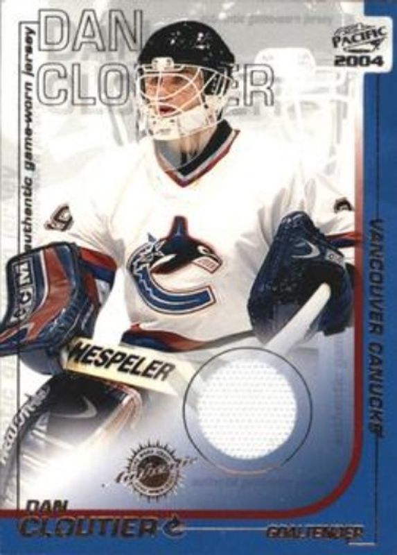 The Dan Cloutier 2003 Pacific #39 Jerseys card is 1 of 8 Dan Cloutier's card variations in the 2003 Pacific set being tracked by Sports Card Investor, including Base /999, Red, Blue /250, In the Crease, and Jerseys Gold /50.
