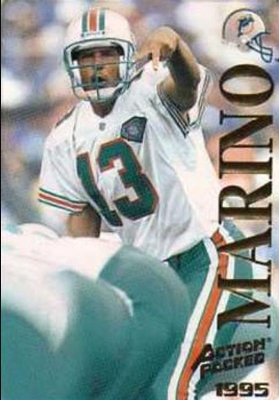 The Dan Marino 1995 Action Packed Flagship #21 Base card is 1 of 6 Dan Marino's card variations in the 1995 Action Packed Flagship set being tracked by Sports Card Investor, including Quick Silver, 24K Gold, Armed Forces, Armed Forces Braille, and Rocket Man.