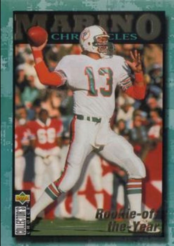 The Dan Marino 1995 Upper Deck Collector's Choice #DM1 Marino Chronicles 5x7 card is 1 of 40 Dan Marino's card variations in the 1995 Upper Deck Collector's Choice set being tracked by Sports Card Investor, including #109 Base, #347 Base, #39 Base, #39 Platinum Player's Club, and #347 Platinum Player's Club.