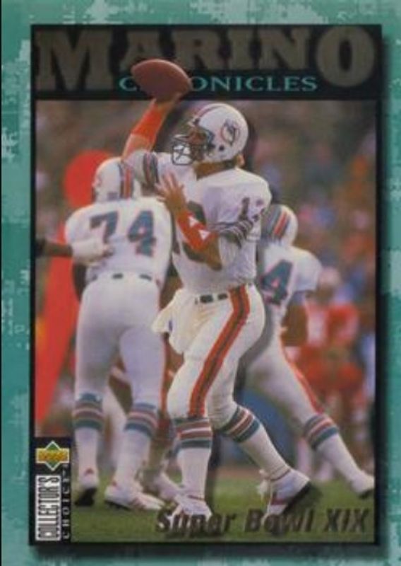 The Dan Marino 1995 Upper Deck Collector's Choice #DM4 Marino Chronicles 5x7 card is 1 of 40 Dan Marino's card variations in the 1995 Upper Deck Collector's Choice set being tracked by Sports Card Investor, including #109 Base, #347 Base, #39 Base, #39 Platinum Player's Club, and #347 Platinum Player's Club.