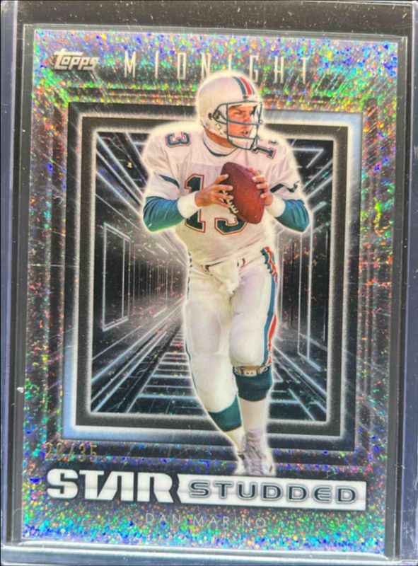 The Dan Marino 2024 Topps Midnight #SS-26 Star Studded - Winter Solstice /35 card is 1 of 31 Dan Marino's card variations in the 2024 Topps Midnight set being tracked by Sports Card Investor, including Base, Moon Beam, Zodiac, Morning /149, and Twilight /99.