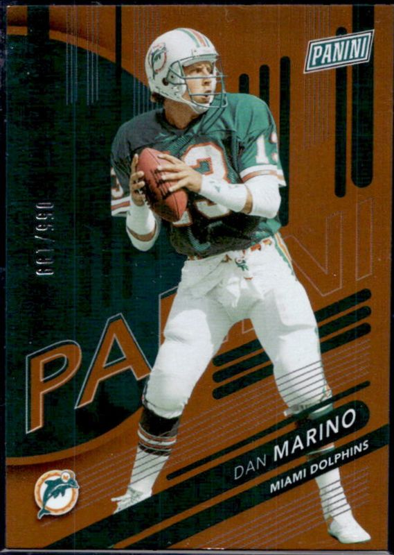 The Dan Marino 2024 Panini NSCC Wrapper Redemption #17 Orange /199 card is 1 of 10 Dan Marino's card variations in the 2024 Panini NSCC Wrapper Redemption set being tracked by Sports Card Investor, including Base, Foil, Red /99, Blue /50, and Cracked Ice /25.