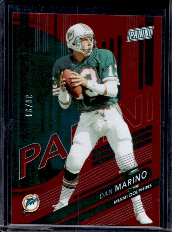 The Dan Marino 2024 Panini NSCC Wrapper Redemption #17 Red /99 card is 1 of 10 Dan Marino's card variations in the 2024 Panini NSCC Wrapper Redemption set being tracked by Sports Card Investor, including Base, Foil, Orange /199, Blue /50, and Cracked Ice /25.