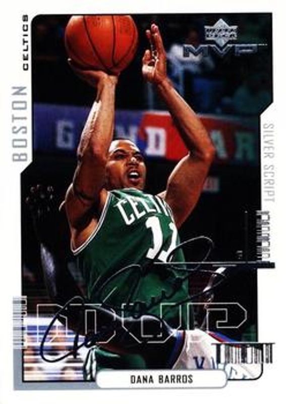 The Dana Barros 2000 Upper Deck MVP #13 Silver Script card is 1 of 4 Dana Barros' card variations in the 2000 Upper Deck MVP set being tracked by Sports Card Investor, including Base, Gold Script /100, and Super Script /25.