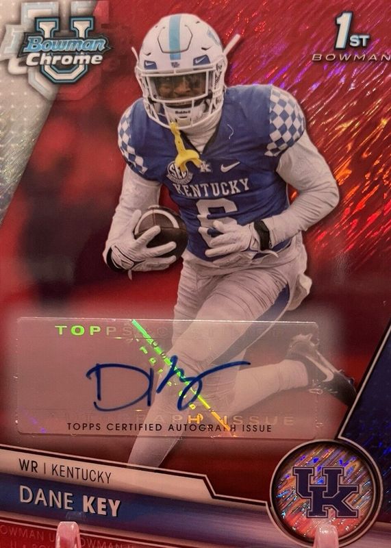 This card is 1 of 12 Dane Key's card variations in the 2023 Bowman Chrome University set being tracked by Sports Card Investor, including Prospect Auto (1st), Prospect Auto - Refractor /499 (1st), Prospect Auto - Fuchsia Mini-Diamond Refractor /150 (1st), Prospect Auto - Green Refractor /99 (1st), and Prospect Auto - Yellow Refractor /75 (1st).