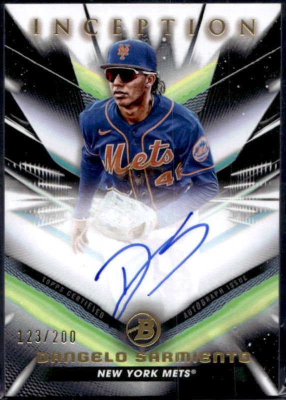 The Dangelo Sarmiento 2023 Bowman Inception #BPA-DS Autographs /300 card is 1 of 8 Dangelo Sarmiento's card variations in the 2023 Bowman Inception set being tracked by Sports Card Investor, including Autographs - Blue Foil /99, Autographs - Fuchsia Foil /75, Autographs - Gold Foil /50, Autographs - Gold Foil Electricity /50, and Autographs - Orange Foil /25.