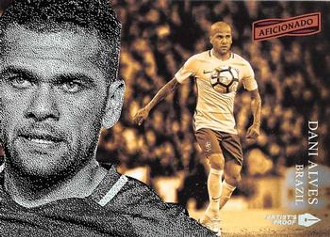 The Dani Alves 2016 Aficionado #65 Artist's Proof card is 1 of 8 Dani Alves' card variations in the 2016 Aficionado set being tracked by Sports Card Investor, including Base, First Kick, Artist's Proof Red /99, Artist's Proof Bronze /49, and Artist's Proof Gold /1.