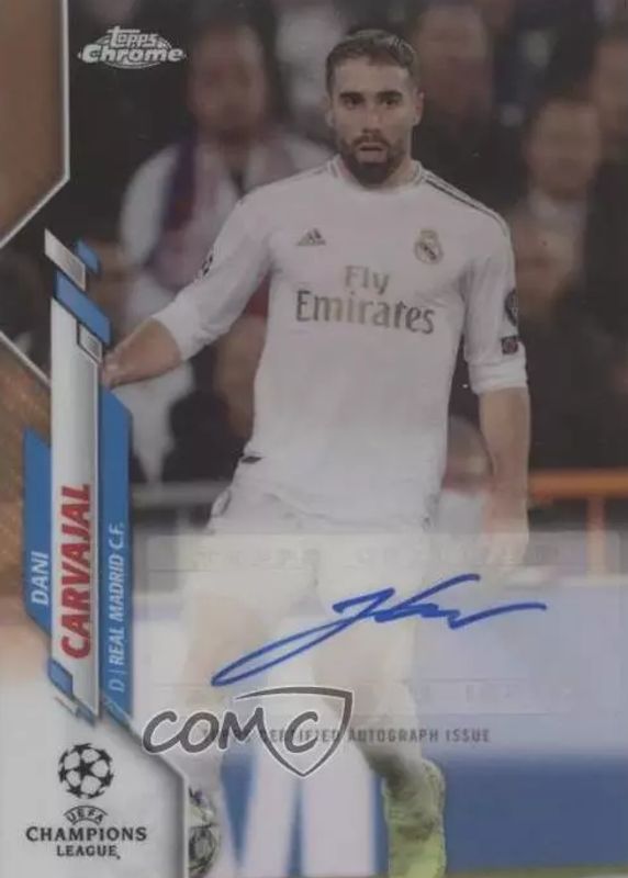The Dani Carvajal 2019 Topps Chrome UEFA Champions League #CA-DAC Autographs - Orange Refractor /25 card in Raw condition has not changed in price in the last 30 days and was last sold for $40.79 .