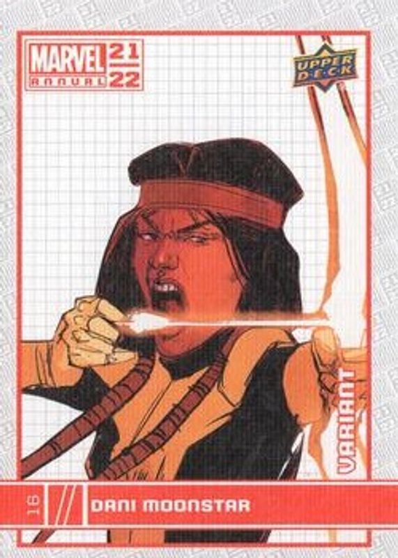 The Dani Moonstar 2021 Upper Deck Marvel Annual #16 Canvas Variant card is 1 of 15 Dani Moonstar's card variations in the 2021 Upper Deck Marvel Annual set being tracked by Sports Card Investor, including Base, Blue, Green, Magenta, and Red.