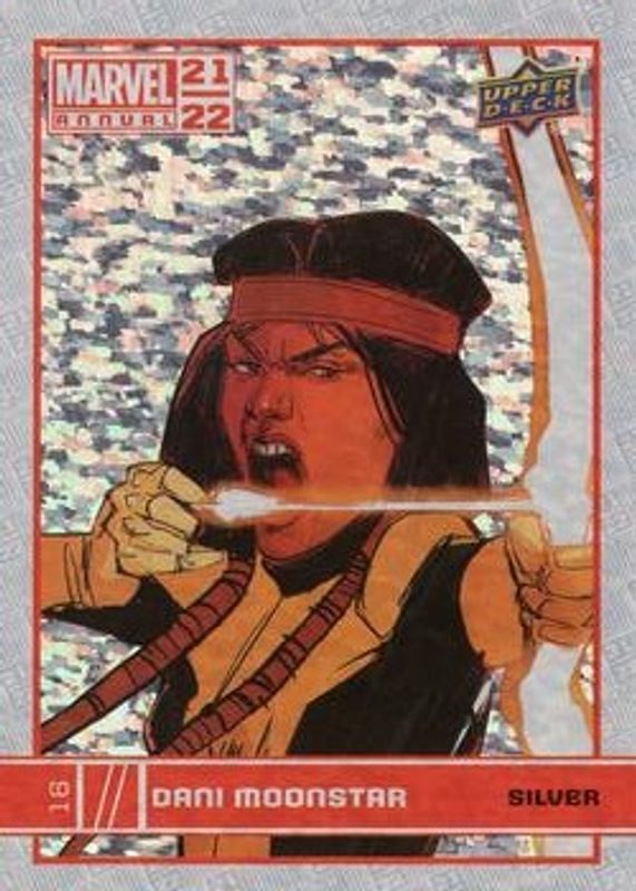 The Dani Moonstar 2021 Upper Deck Marvel Annual #16 Silver Sparkle card is 1 of 15 Dani Moonstar's card variations in the 2021 Upper Deck Marvel Annual set being tracked by Sports Card Investor, including Base, Blue, Canvas Variant, Green, and Magenta.