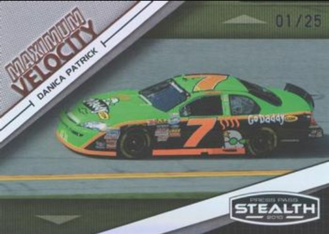 The Danica Patrick 2010 Press Pass Stealth #54 Purple /25 card is 1 of 15 Danica Patrick's card variations in the 2010 Press Pass Stealth set being tracked by Sports Card Investor, including #54 Base, #41 Base, #41 Black & White, #54 Black & White, and #VIP-6 National Convention.
