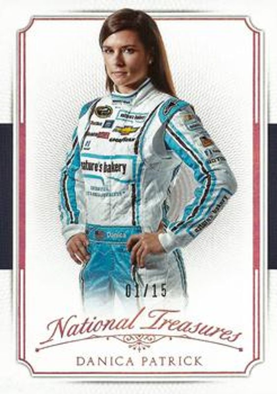 The Danica Patrick 2016 National Treasures NASCAR #5 Century Gold /15 card is 1 of 101 Danica Patrick's card variations in the 2016 National Treasures NASCAR set being tracked by Sports Card Investor, including #30 Base /25, #5 Base /25, #30 Century Silver /20, #5 Century Silver /20, and #30 Century Gold /15.