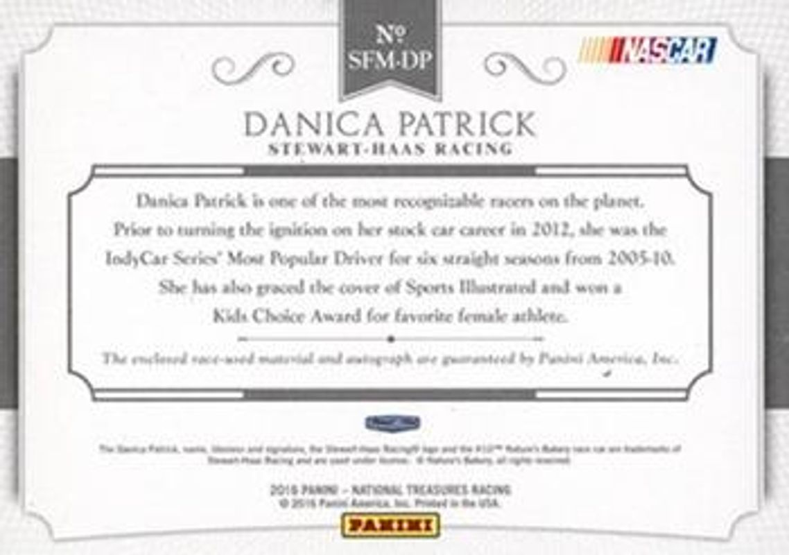 The Danica Patrick 2016 National Treasures NASCAR #SFM-DP Signatures Firesuit Materials Laundry Tags /1 card is 1 of 101 Danica Patrick's card variations in the 2016 National Treasures NASCAR set being tracked by Sports Card Investor, including #30 Base /25, #5 Base /25, #30 Century Silver /20, #5 Century Silver /20, and #30 Century Gold /15.