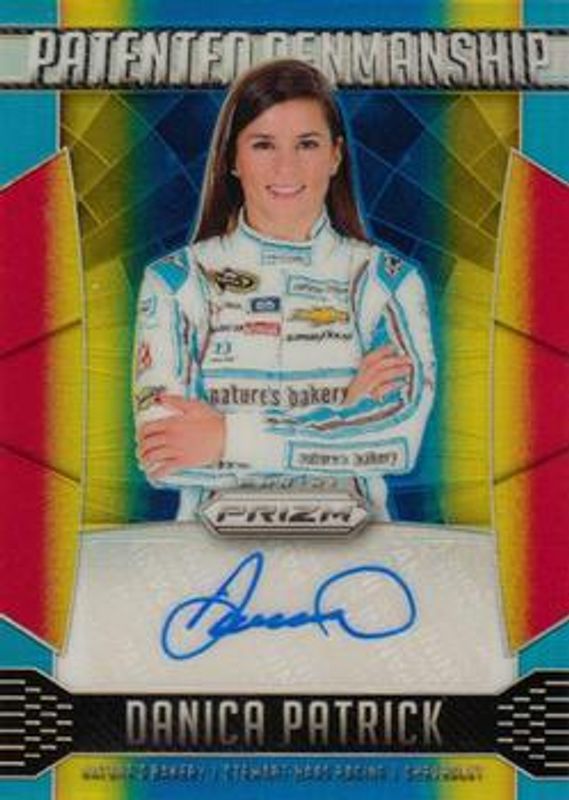 The Danica Patrick 2016 Prizm NASCAR #PP-DP Patented Penmanship - Rainbow /24 card is 1 of 77 Danica Patrick's card variations in the 2016 Prizm NASCAR set being tracked by Sports Card Investor, including #57 Base, #80 Base, #10 Base, #80 Camo, and #10 Camo.