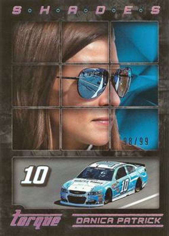 The Danica Patrick 2016 Torque NASCAR #S4 Shades Holo Silver /99 card is 1 of 110 Danica Patrick's card variations in the 2016 Torque NASCAR set being tracked by Sports Card Investor, including #31 Base, #76 Base, #31 Gold, #76 Gold, and #31 Blue /125.