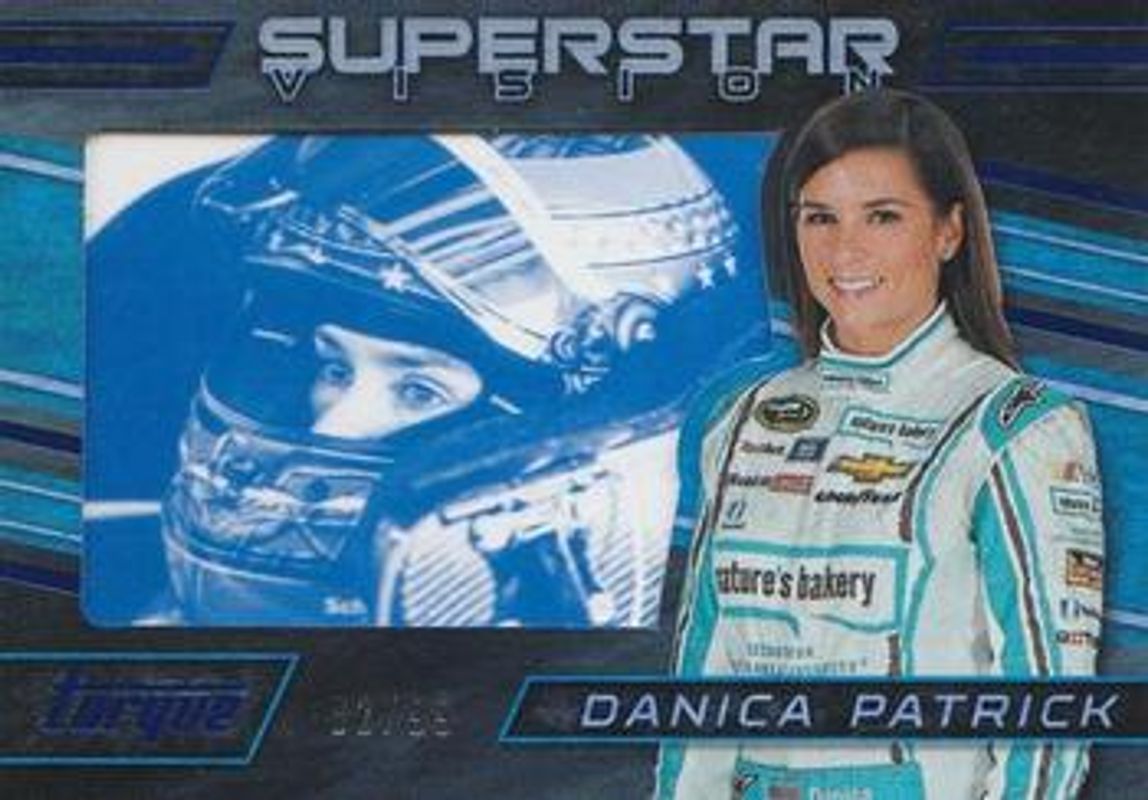 The Danica Patrick 2016 Torque NASCAR #SV4 Superstar Vision Blue /99 card is 1 of 110 Danica Patrick's card variations in the 2016 Torque NASCAR set being tracked by Sports Card Investor, including #31 Base, #76 Base, #31 Gold, #76 Gold, and #31 Blue /125.