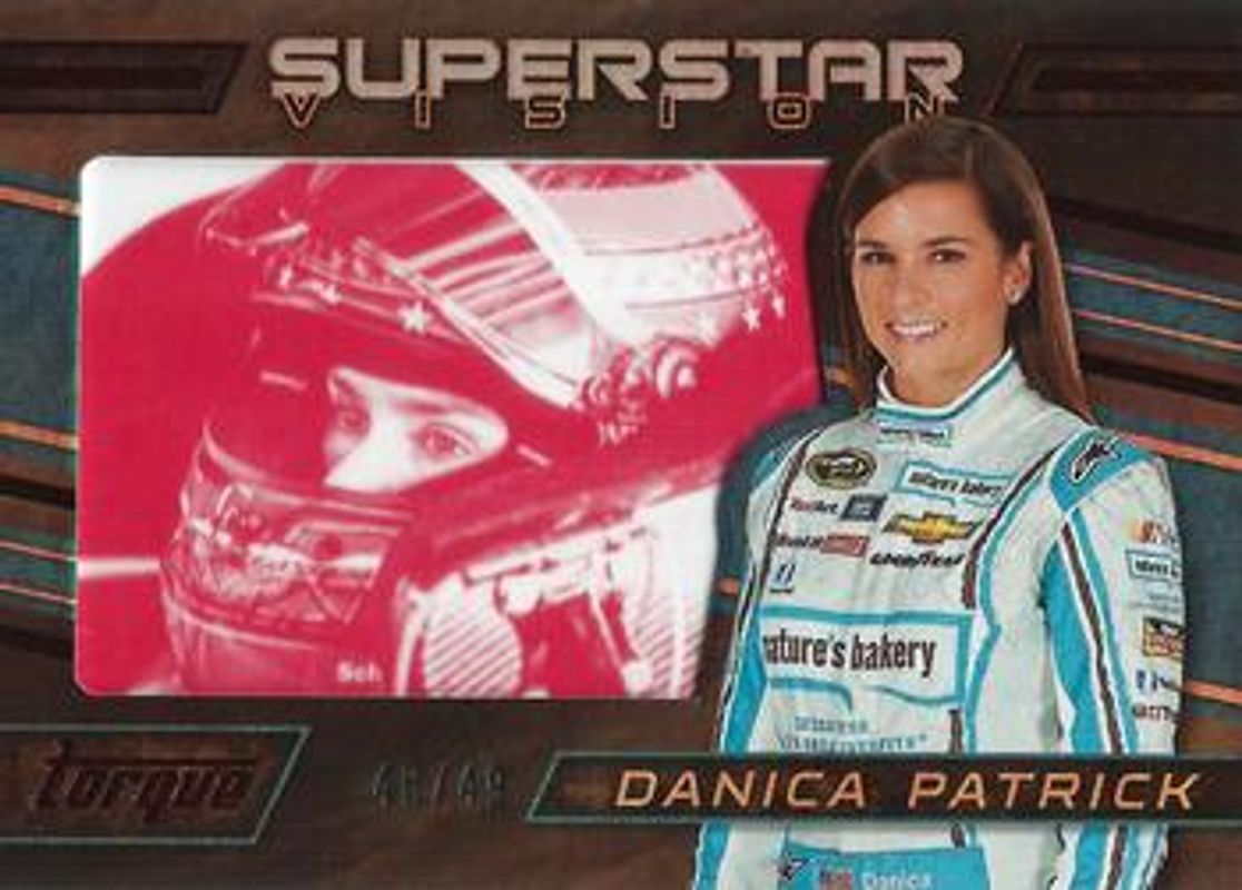 The Danica Patrick 2016 Torque NASCAR #SV4 Superstar Vision Red /49 card is 1 of 110 Danica Patrick's card variations in the 2016 Torque NASCAR set being tracked by Sports Card Investor, including #31 Base, #76 Base, #31 Gold, #76 Gold, and #31 Blue /125.