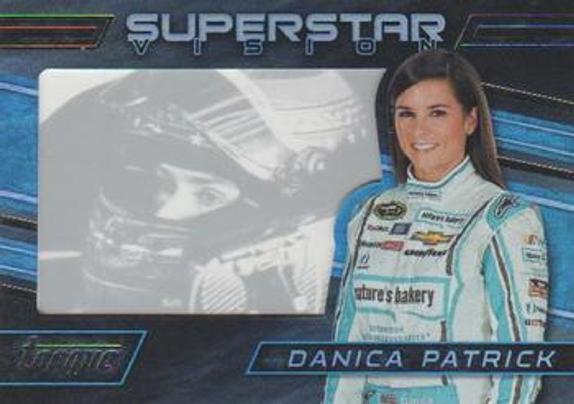 The Danica Patrick 2016 Torque NASCAR #SV4 Superstar Vision card is 1 of 110 Danica Patrick's card variations in the 2016 Torque NASCAR set being tracked by Sports Card Investor, including #31 Base, #76 Base, #31 Gold, #76 Gold, and #31 Blue /125.