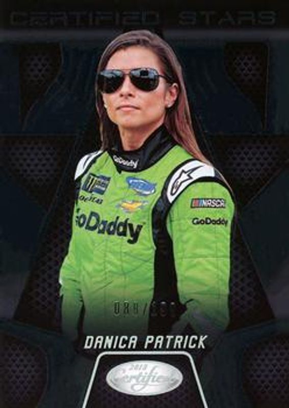 The Danica Patrick 2018 Certified NASCAR #CS6 Certified Stars /199 card is 1 of 78 Danica Patrick's card variations in the 2018 Certified NASCAR set being tracked by Sports Card Investor, including #72 Base /149, #95 Base /149, #72 Orange /249, #95 Orange /249, and #72 Mirror Gold /25.